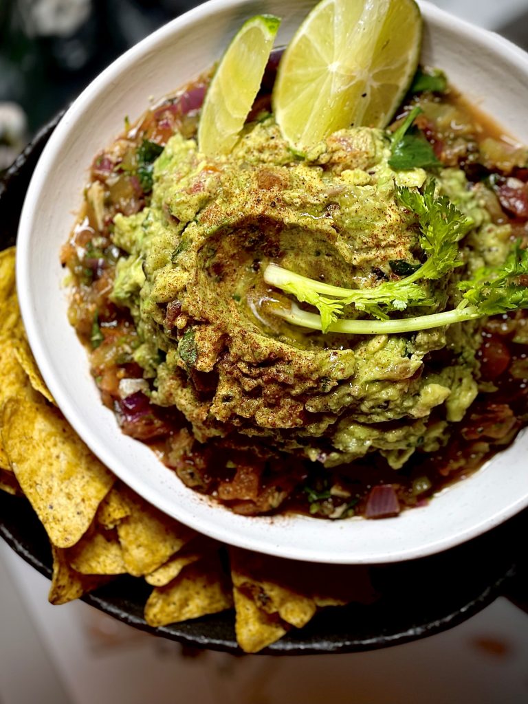 A smokey, mellow take on a classic Guacamole accompanied with a tangy salsa. Pre-grilled, lightly charred ingredients is the secret to this upgraded delicious all time favourite.Ingredients: 1 red onion, 2 to 4 (depending on heat preference) jalapeños or any seasonal peppers. 2 limes 2 Roma tomatoes 2 avocados 2 cloves garlic Olive oil 1